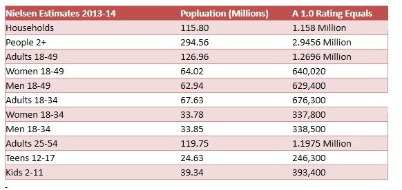 用上图就是代表美国2013-2014年有1亿2696万 18-49岁的人,2.0其实是「%」,,1%就有127万人,美帝目前算收视率是由ACNielsen(俗称尼尔森)以安装了电视机盒的数据来计算。用上图算就代表有254万18-49岁的人在看,余下644万就即是区域外。