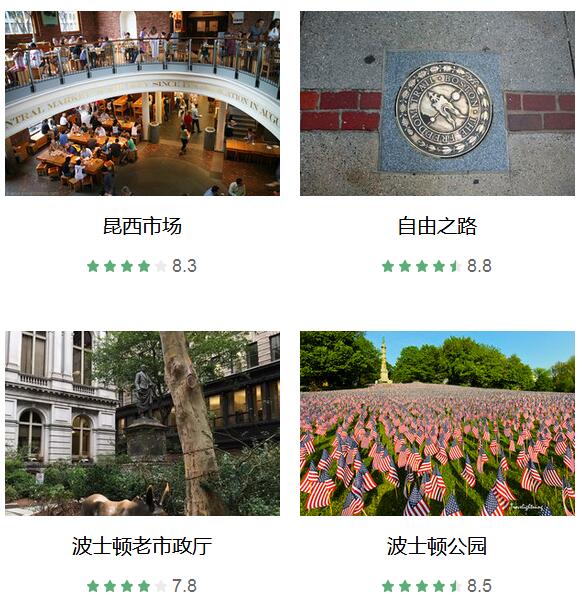 哈佛大学 、 昆西市场 、 麻省理工学院 、 自由之路 、 哈佛广场 、 三一教堂 、 波士顿老市政厅 、 波士顿公园 、 波士顿公共图书馆 、 老州议会大厦 、 唐人街 、 波士顿美术博物馆