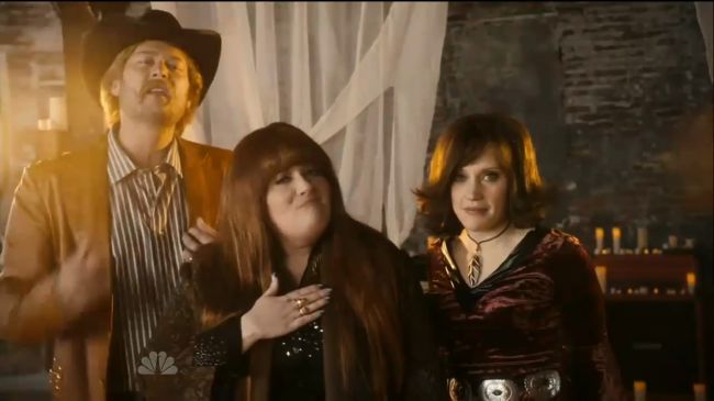 之前纠正别人的微博说过了。虽然SNL方面没说,但是我按造型推断Blake Shelton模仿的是Alan Jackson(金发二撇胡村男不多),Kate McKinnon模仿的是Reba McEntire(嗓音+ 造型),Aidy Bryant模仿的是Wynonna Judd(造型神似登峰造极,比Aidy之前模仿的Adele还要像)。歌很洗脑,我已经会哼了。