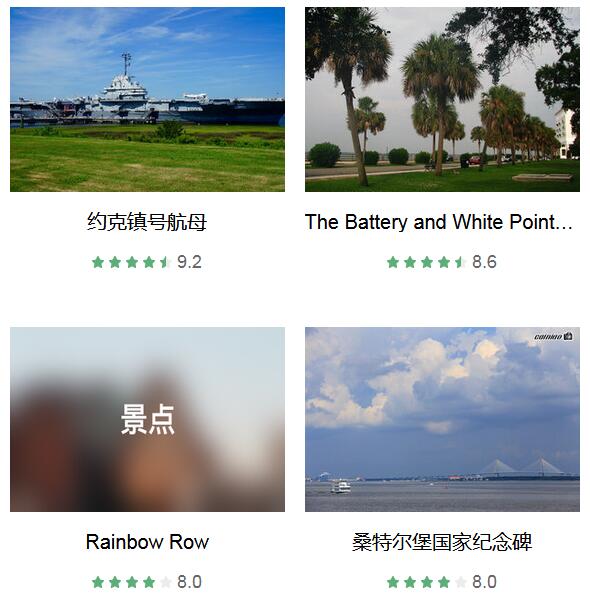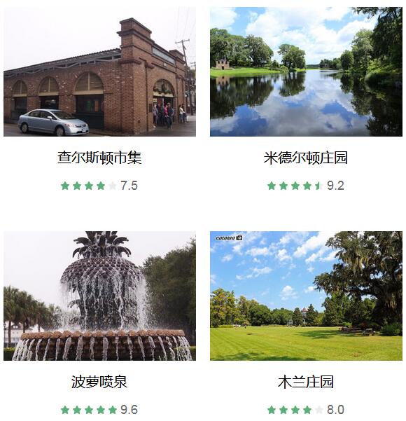 查尔斯顿市集 、 米德尔顿庄园 、 约克镇号航母 、 The Battery and White Point花园 、 波萝喷泉 、 木兰庄园 、 Rainbow Row 、 桑特尔堡国家纪念碑 、 旧时奴隶交易博物馆 、