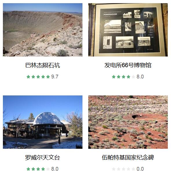 巴林杰陨石坑 、 发电所66号博物馆 、 日落火山口 、 San Francisco山 、 罗威尔天文台 、 Arizona Snowbowl滑雪场 、 伍帕特基国家纪念碑 、 雪帽子汽车餐厅 、 博物馆俱乐部