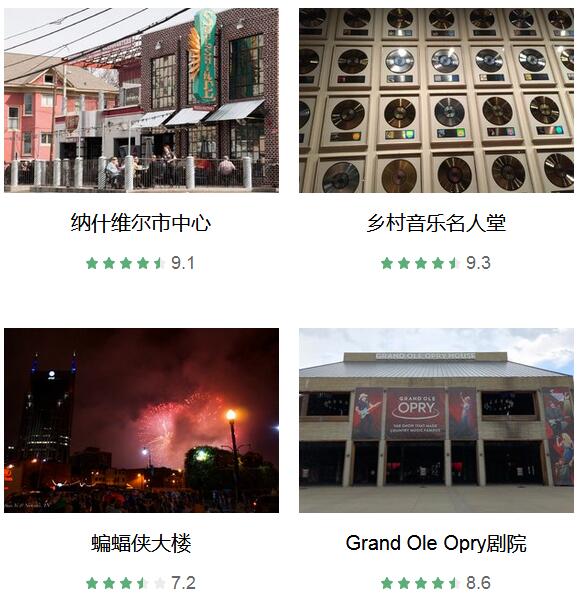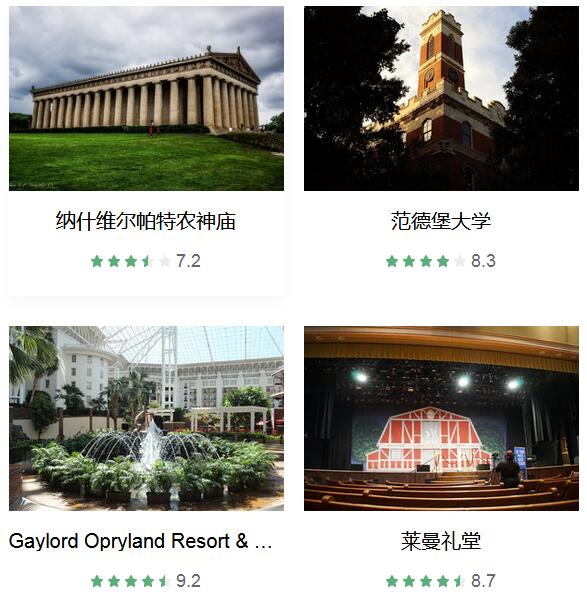 纳什维尔市中心 、 乡村音乐名人堂 、 纳什维尔帕特农神庙 、 范德堡大学 、 蝙蝠侠大楼 、 Grand Ole Opry剧院 、 Gaylord Opryland Resort & Convention Center 、 莱曼礼堂