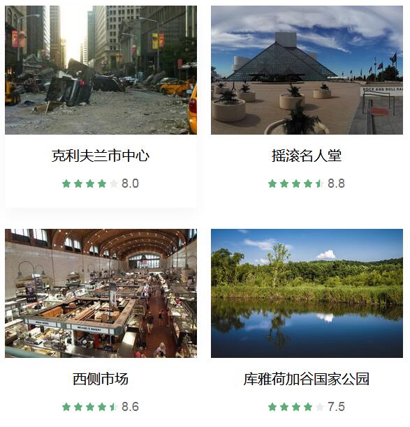 克利夫兰市中心 、 摇滚名人堂 、 克利夫兰艺术博物馆 、 克利夫兰公共广场 、 西侧市场 、 库雅荷加谷国家公园 、 速贷中心球馆 、 湖景公墓 、 终端塔 、 克利夫兰商场 、 西部保留