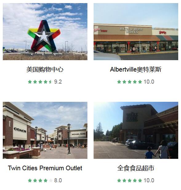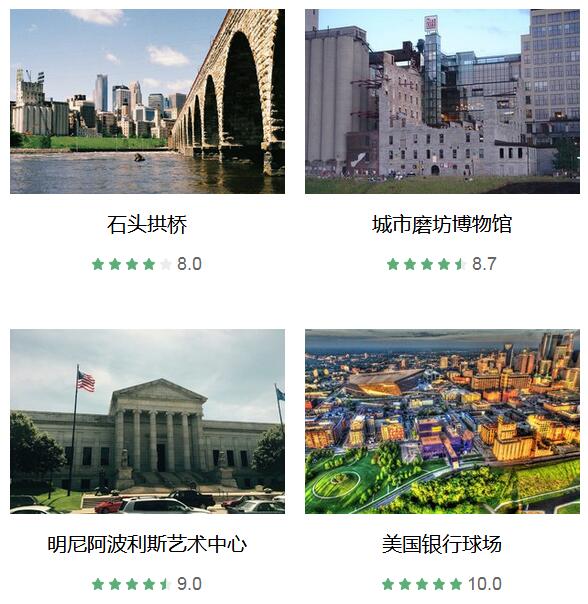 明尼阿波利斯市中心 、 美国购物中心 、 明尼阿波利斯市政厅 、 石头拱桥 、 城市磨坊博物馆 、 Albertville奥特莱斯 、 卡洪湖 、 沃克艺术中心 、 标靶中心球场 、 明尼阿波利斯艺术
