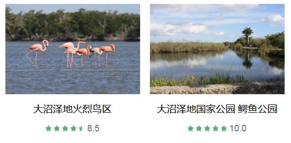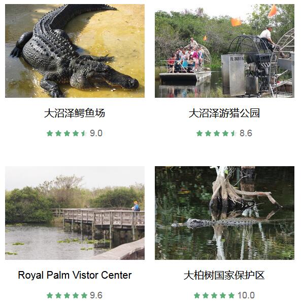 大沼泽鳄鱼场 、 大沼泽游猎公园 、 大沼泽地火烈鸟区 、 大沼泽地国家公园 鳄鱼公园 、 Royal Palm Vistor Center 、 大柏树国家保护区