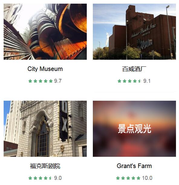 圣路易斯拱门 、 圣路易斯森林公园 、 圣路易斯动物园 、 圣路易斯中央车站 、 圣路易斯大教堂 、 City Museum 、 百威酒厂 、 密苏里州老法院 、 圣路易斯艺术博物馆 、 密苏里植物
