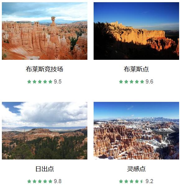 布莱斯竞技场 、 布莱斯点 、 布莱斯峡谷国家公园游客中心 、 日落点 、 日出点 、 灵感点 、 天然桥 、 Navajo Loop Trail 、 望远点 、 彩虹点和佑维帕点 、 帕里亚观景台 、 童话境点