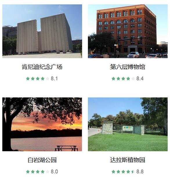 肯尼迪纪念广场 、 第六层博物馆 、 达拉斯艺术博物馆 、 美国航空中心体育馆 、 白岩湖公园 、 达拉斯植物园 、 美国南卫理公会大学 、 达拉斯—沃思堡国际机场 、 Allen 奥特莱斯