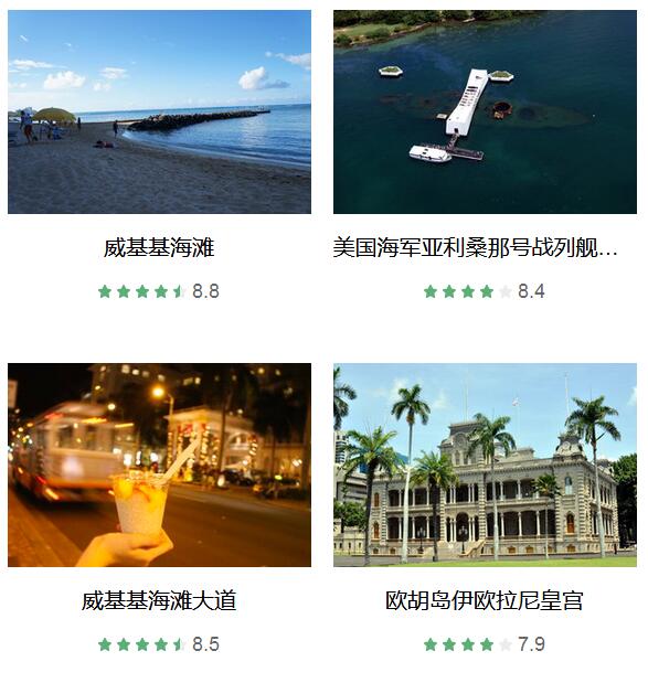 威基基海滩 、 美国海军亚利桑那号战列舰纪念馆 、 夏威夷钻石头山 、 密苏里号战舰纪念馆 、 威基基海滩大道 、 欧胡岛伊欧拉尼皇宫 、 夏威夷日落海滩(欧胡岛) 、 钻石头山登顶