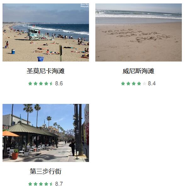 圣莫尼卡海滩 、 威尼斯海滩 、 66号公路终点 、 太平洋游乐场 、 第三步行街 、 In-n-Out汉堡 、 Urth Caffé (圣莫尼卡店) 、 Bubba Gump Shrimp Co. (Santa Monica) 、 Bru 华夫餐厅