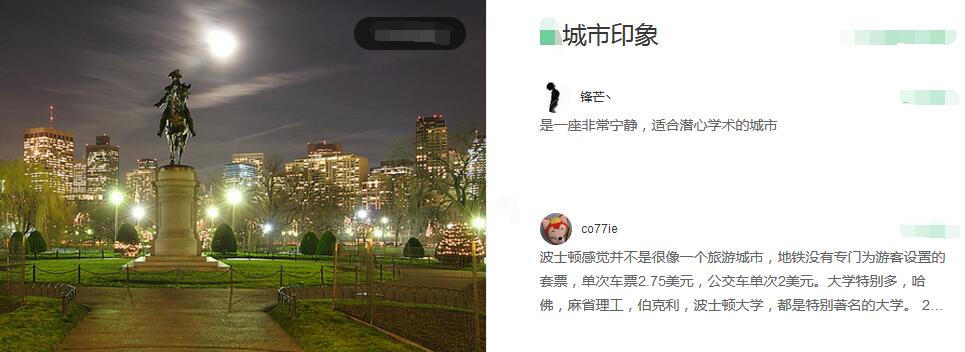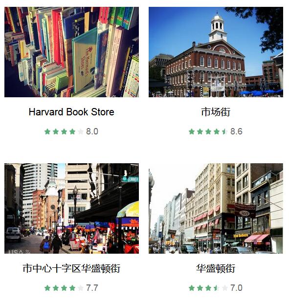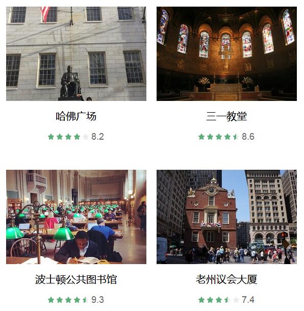 哈佛大学 、 昆西市场 、 麻省理工学院 、 自由之路 、 哈佛广场 、 三一教堂 、 波士顿老市政厅 、 波士顿公园 、 波士顿公共图书馆 、 老州议会大厦 、 唐人街 、 波士顿美术博物馆