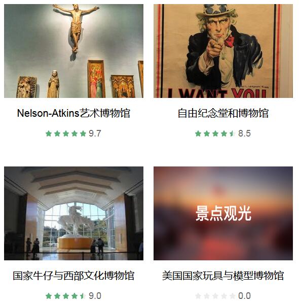 Nelson-Atkins艺术博物馆 、 自由纪念堂和博物馆 、 考夫曼的表演艺术中心 、 乡村俱乐部购物区 、 菲奥雷拉杰克烧烤 、 考夫曼球场 、 Joe's Kansas City 、 国家牛仔与西部文化博物