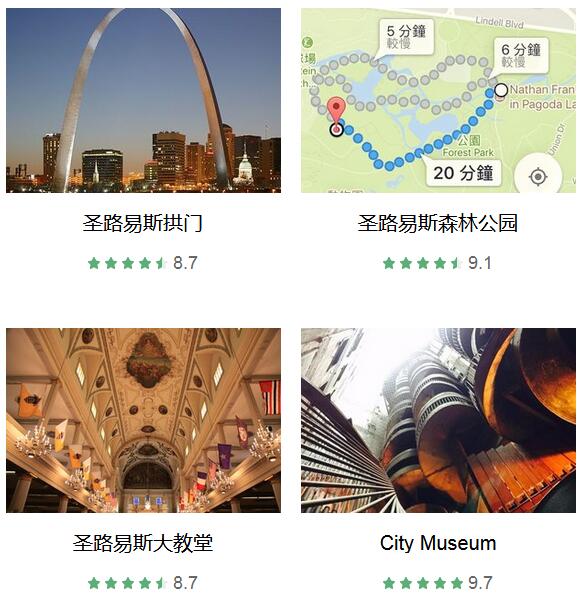 圣路易斯拱门 、 圣路易斯森林公园 、 圣路易斯动物园 、 圣路易斯中央车站 、 圣路易斯大教堂 、 City Museum 、 百威酒厂 、 密苏里州老法院 、 圣路易斯艺术博物馆 、 密苏里植物