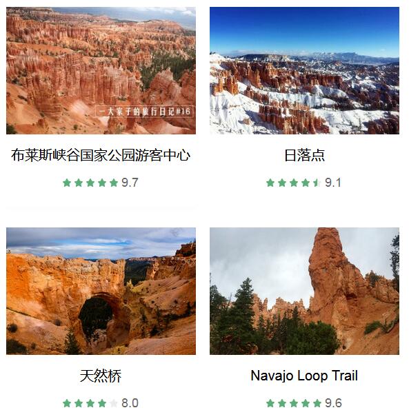 布莱斯竞技场 、 布莱斯点 、 布莱斯峡谷国家公园游客中心 、 日落点 、 日出点 、 灵感点 、 天然桥 、 Navajo Loop Trail 、 望远点 、 彩虹点和佑维帕点 、 帕里亚观景台 、 童话境点