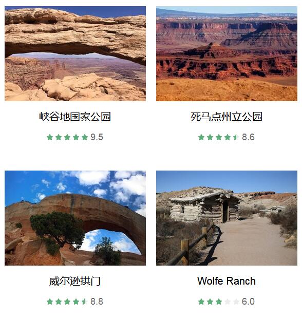 双零拱门 、 科罗纳拱门 、 峡谷地国家公园 、 死马点州立公园 、 鹅颈湾州立公园 、 科罗拉多国家纪念碑 、 威尔逊拱门 、 四川榕 、 Wolfe Ranch 、 Arches Thai 、 Pasta Jay's