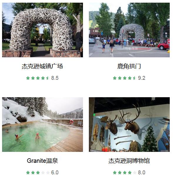 杰克逊城镇广场 、 鹿角拱门 、 蛇河大峡谷 、 国家麋鹿保护区 、 Granite温泉 、 杰克逊洞博物馆 、 野生动物艺术国家博物馆 、 Jackson Hole 、 Jackson Hole Airport, JAC