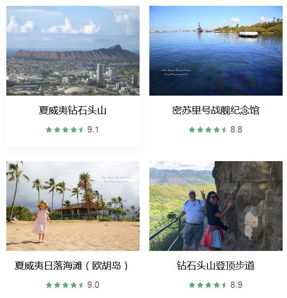 威基基海滩 、 美国海军亚利桑那号战列舰纪念馆 、 夏威夷钻石头山 、 密苏里号战舰纪念馆 、 威基基海滩大道 、 欧胡岛伊欧拉尼皇宫 、 夏威夷日落海滩(欧胡岛) 、 钻石头山登顶
