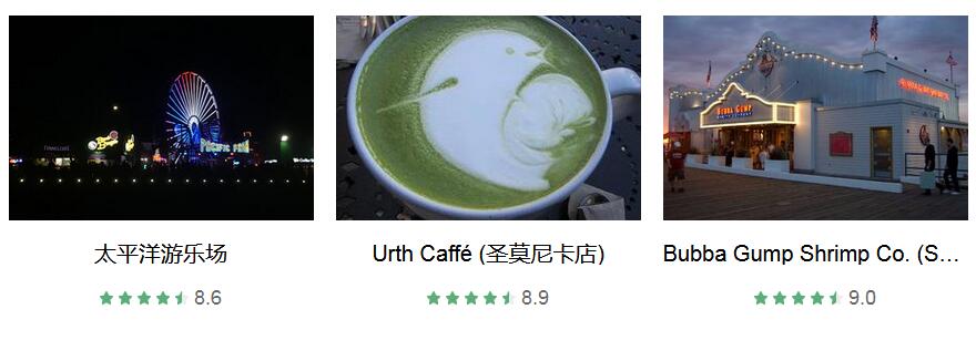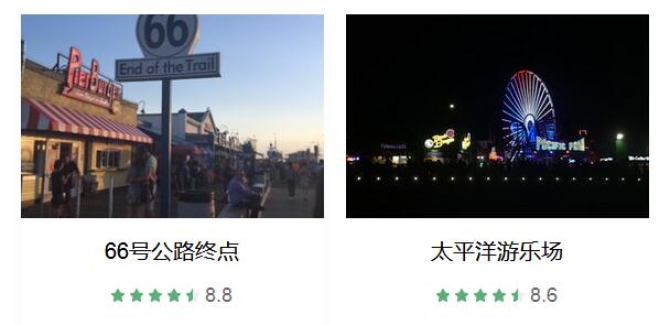 圣莫尼卡海滩 、 威尼斯海滩 、 66号公路终点 、 太平洋游乐场 、 第三步行街 、 In-n-Out汉堡 、 Urth Caffé (圣莫尼卡店) 、 Bubba Gump Shrimp Co. (Santa Monica) 、 Bru 华夫餐厅